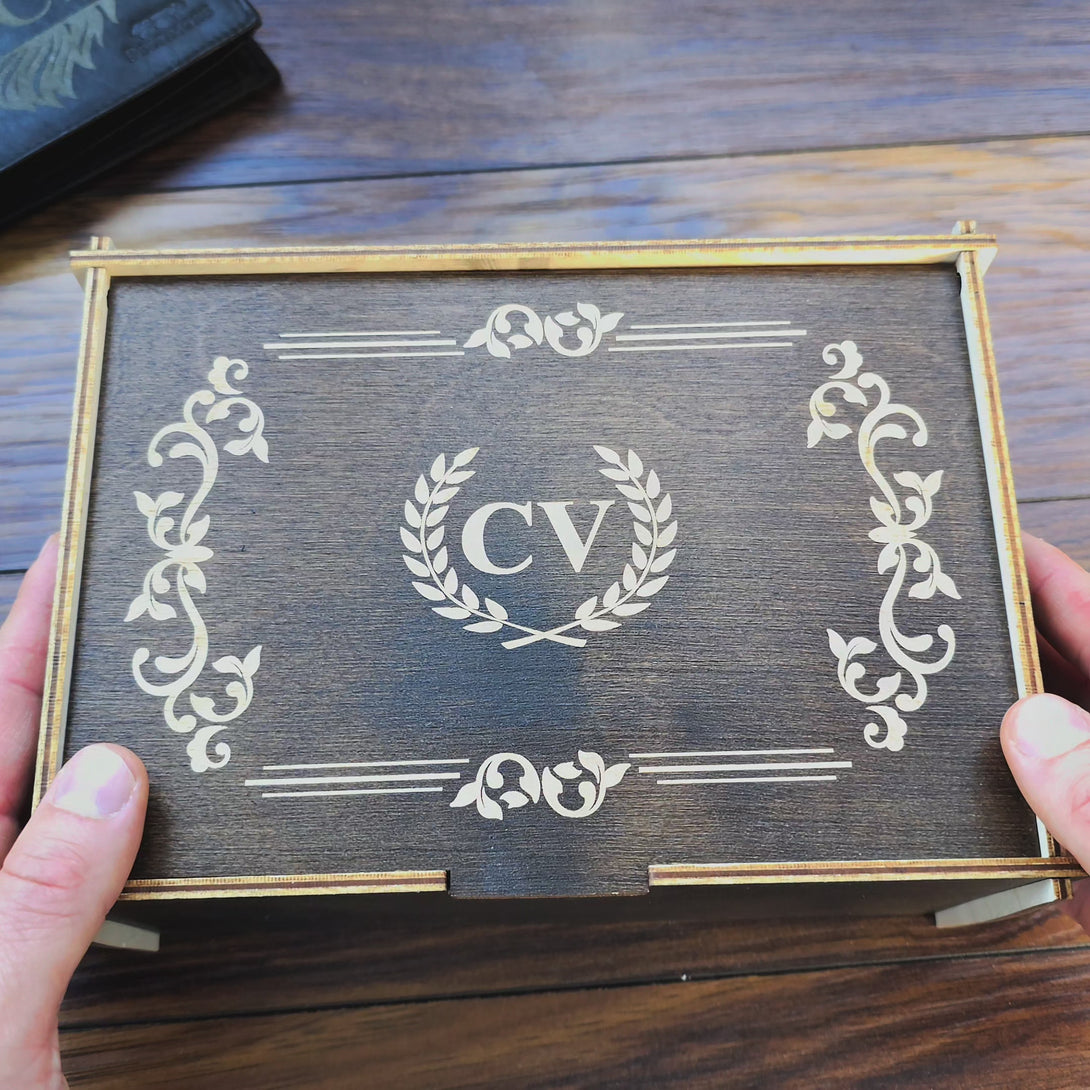 Personalized wooden gift box with engraved initials CV, for leather wallet and belt gift set for men