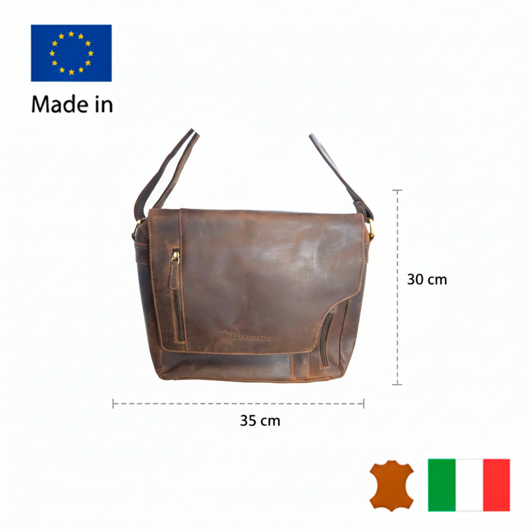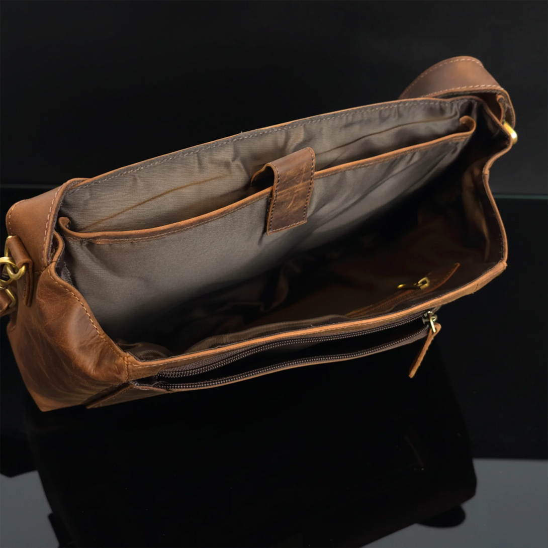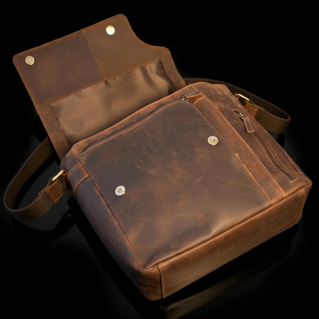 Tillverkad av premium nubuck äkta läder i en elegant åldrad brun ton, är denna exklusiva vintageinspirerade väska designad för dem som värdesätter hantverk och funktionalitet.