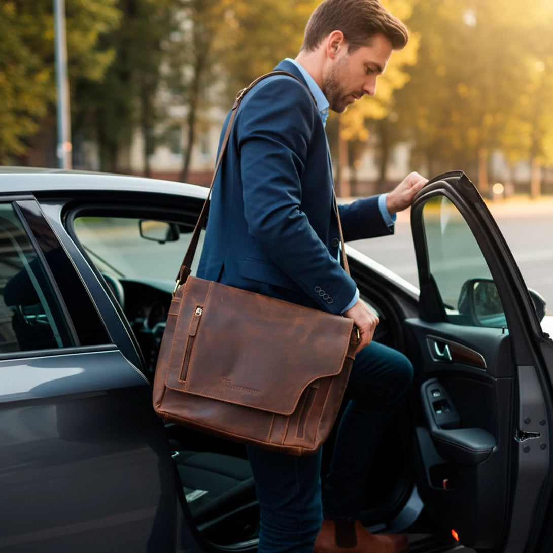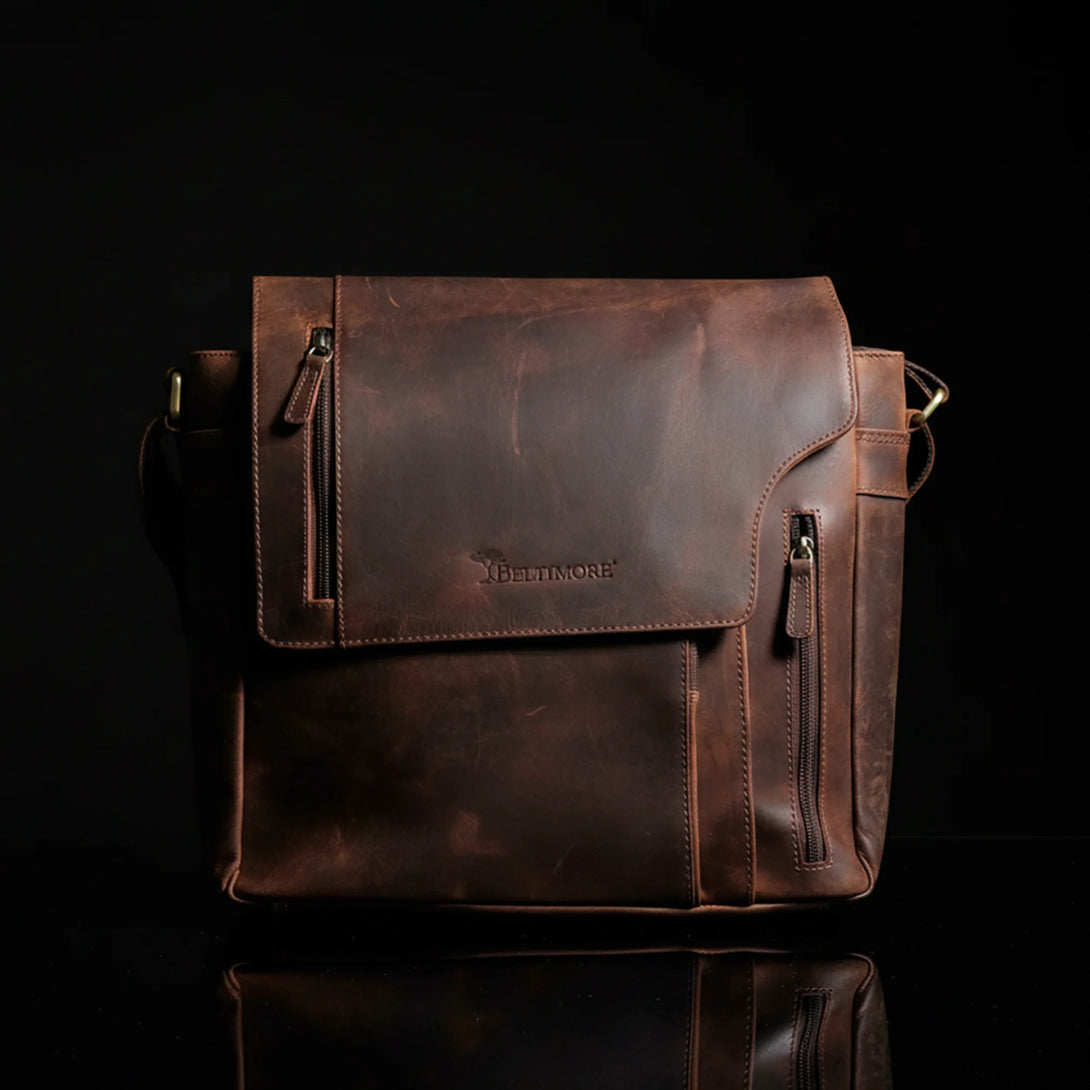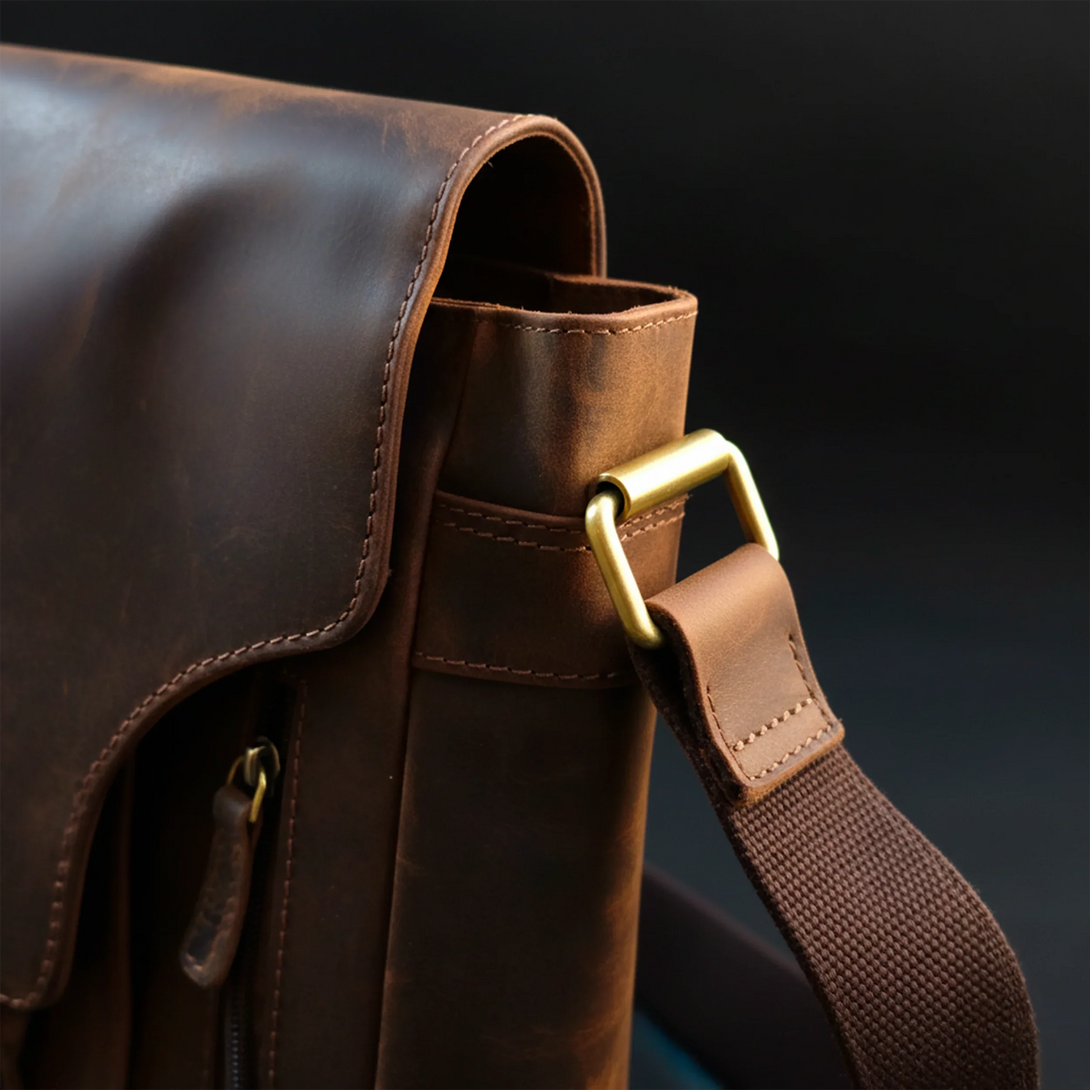 Tillverkad av premium nubuck äkta läder i en elegant åldrad brun ton, är denna exklusiva vintageinspirerade väska designad för dem som värdesätter hantverk och funktionalitet.